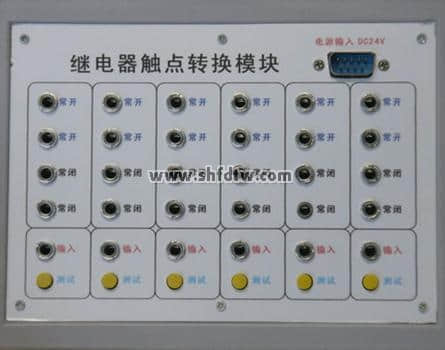 利用每組的測試按鈕作為主令按鈕,同時為繼電器控制模塊提供兩個常開啟動信號、兩個常閉信號。利用每組的輸入插孔,對接入的觸點開關信號進行轉換及擴展。并可以輸入三線傳感器信號(正電源、負電源、信號)。
