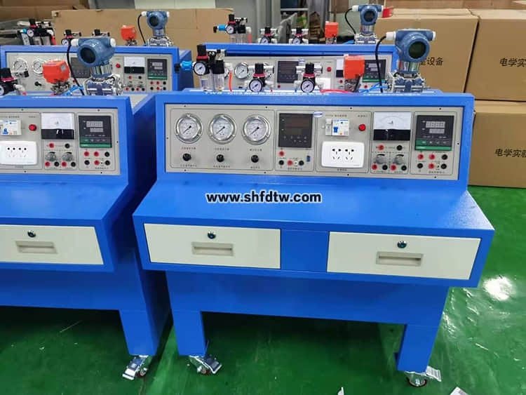 鋼質(zhì)、臺(tái)面不小于1500×700mm,后側(cè)置高于臺(tái)面300mm左右的斜面,便于布置各種輔助儀表等設(shè)備,包括0~0.1MPa壓力表,4~20mA電流表,0.7MPa的氣源壓力表,24VDC100W模塊。臺(tái)內(nèi)置模塊的抽屜,方便替換和放置。4個(gè)腳安裝帶制動(dòng)的萬(wàn)向滑輪,便于實(shí)驗(yàn)臺(tái)移動(dòng)。