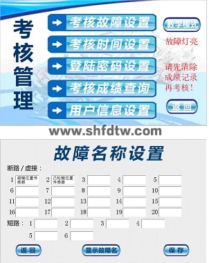1)該系統(tǒng)由安卓藍牙的故障設(shè)置系統(tǒng)和觸摸屏的故障考核系統(tǒng)兩部分組成。教師在講課時,用帶安卓系統(tǒng)的手機或平板電腦遠程無線設(shè)置故障,遠程啟動、停止教學(xué)設(shè)備,方便教師教學(xué)講課。學(xué)生考核是在觸摸屏故障考核系統(tǒng)上完成的。教師和學(xué)生界面分開,教師輸入密碼進入教師界面出題并設(shè)置考試時間啟用后,學(xué)生才能開始考核。教師界面故障類型為斷路故障、虛接故障、短路故障三種,教師可任意出題,設(shè)置故障后,屏幕上按鈕會由綠色變?yōu)榧t色,同時繼電器板動作,設(shè)備產(chǎn)生故障。學(xué)生在答題界面會顯示學(xué)號、剩余時間、故障總數(shù),學(xué)生在設(shè)備上檢測查出故障后,選擇相應(yīng)的故障按鈕,屏幕上按鈕會由紅色變綠色,故障選擇完畢后,點擊提交試卷后,就會看到本次考試成績。