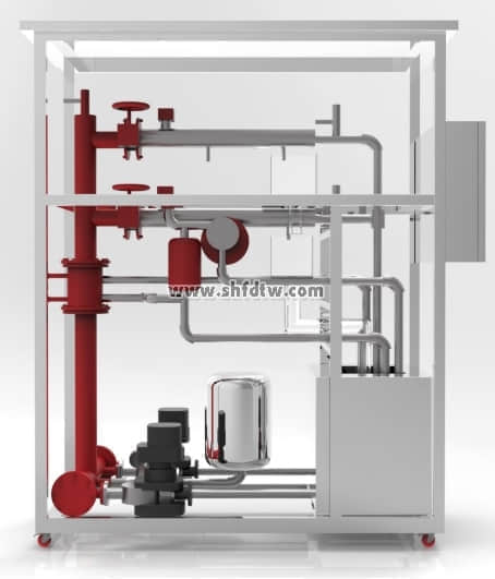 噴淋滅火系統(tǒng)的模型框架和水箱等主要部件使用不銹鋼器件,有噴淋水泵、氣壓罐、濕式報(bào)警閥、水力警鈴、延時(shí)器、壓力開關(guān)、水流指示器、封閉式噴頭、試驗(yàn)閥、火災(zāi)探測(cè)器、火災(zāi)報(bào)警器等典型噴水滅火設(shè)備構(gòu)成,能生動(dòng)模擬大樓內(nèi)水滅火系統(tǒng)的典型結(jié)構(gòu); 為便于設(shè)備的布置,模型設(shè)四個(gè)可自鎖靜音滾輪。