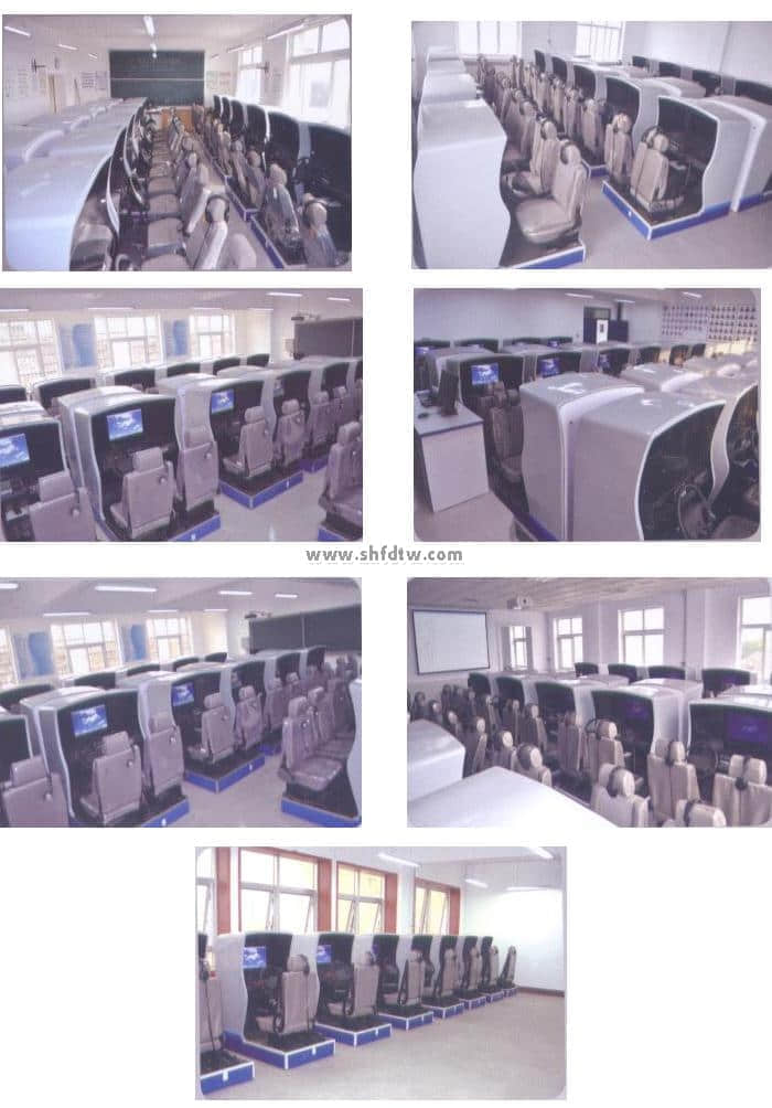 座艙由駕駛艙座,視景計算機,視屏(19寸液晶顯示器),操作傳感器,數據采集卡,耳機和話筒等組成。座艙包含了與真實車輛相同的操作部件,“五大”操縱機構:方向盤、離合器,腳剎,油門和手剎。變速器:倒檔、一檔、二檔、三檔、四檔、五檔和空擋(自動檔只含前進檔、倒車檔和駐車檔)。真車操作開關:左轉向燈、右轉向燈、應急燈、喇叭、點火開關、總電開關、安全帶、車門、雨刷、遠光燈、近光燈、遠近光交替。座艙既可以進行聯網訓練,也可以進行單機訓練。利用主控臺計算機,最多可以將30臺座艙連接到一個訓練場景進行訓練。學員通過操作不同的操作部件,經過各自的傳感器產生不同的操作信號,這些操作信號通過數據采集卡傳送給計算機,經過各種訓練模型的逼真運算,最后在視屏上輸出與操作相對應的三維場景與各種聲音。