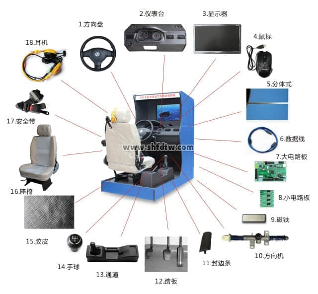 1. 鋼架聚氨酯實車方向盤 2. 塑料材質(zhì)儀表工作臺 3. LED液晶顯示器 4. 光電鼠標(biāo)