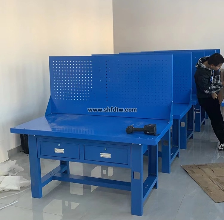 實訓臺為鐵質(zhì)材料,桌面為40mm厚木質(zhì)材料上面鋪上1mm厚鐵板,鋼絲防護網(wǎng)和鉗工桌腳采用方管60×60mm,厚1.2mm。整體結(jié)構(gòu)堅固,造型美觀大方。實訓臺設有兩個抽屜分別用于放置工具及資料等
