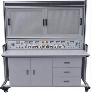 5、實訓桌為鐵質(zhì)雙層亞光密紋噴塑結(jié)構(gòu),桌面為防火、防水、耐磨高密度板,結(jié)構(gòu)堅固,造型美觀大方,桌子左右有抽屜,下部有元件儲存柜。
