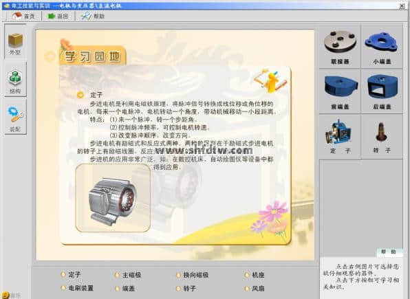 (6)電機與變壓器:主要講解了三相異步電動機、單相異步電動機、伺服電機、步進電機、直流電機與變壓器的外型、結(jié)構(gòu)、裝配與維修等知識。