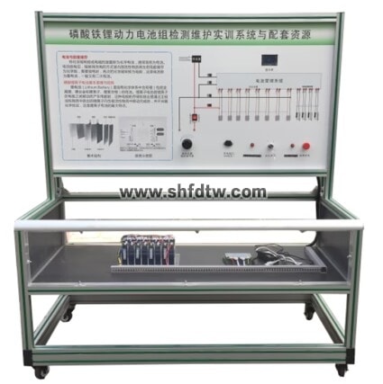 磷酸鐵鋰動力電池包及BMS總成、BMS信息顯示液晶屏(2.3*9.3cm)、電池管理系統(tǒng)(BMS)APP軟件、緊急斷電開關、維修開關、電流與溫度傳感器,直流接觸器,放電線性負載,充電器、一體化全鋁合金型材搭建的移動臺架(700*500*1500mm 帶自鎖腳輪裝置,帶安裝檢測端子的原理面板,面板648*713mm)、故障模擬與排除裝置、設備操作說明書。