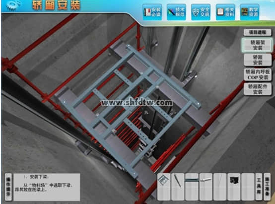 本軟件以德國蒂森-克虜伯立式電梯為實(shí)物模型,就其安裝與典型故障排除進(jìn)行仿真訓(xùn)練,內(nèi)容包含施工準(zhǔn)備、樣板架放線、導(dǎo)軌安裝、限速器安裝、控制柜安裝、層門安裝、外呼板安裝、拽引機(jī)安裝、緩沖器安裝、對重安裝、轎廂安裝、轎門安裝、鋼絲繩安裝、故障檢修1、2、3 等共16 個(gè)仿真實(shí)訓(xùn)項(xiàng)目,每個(gè)實(shí)訓(xùn)單元含有若干個(gè)實(shí)訓(xùn)項(xiàng)目,每個(gè)實(shí)訓(xùn)項(xiàng)目包含若干個(gè)典型的實(shí)訓(xùn)步驟。軟件以實(shí)際工程項(xiàng)目為主線,以施工任務(wù)為引領(lǐng),突出技能訓(xùn)練;強(qiáng)調(diào)職場的工作環(huán)境,全部訓(xùn)練在三維場景下進(jìn)行;重視教學(xué)設(shè)計(jì),不同的知識單元含有諸如安裝必讀、技術(shù)規(guī)范、安全交底、相關(guān)資料、教學(xué)資源、項(xiàng)目進(jìn)程、施工準(zhǔn)備等實(shí)訓(xùn)模塊。