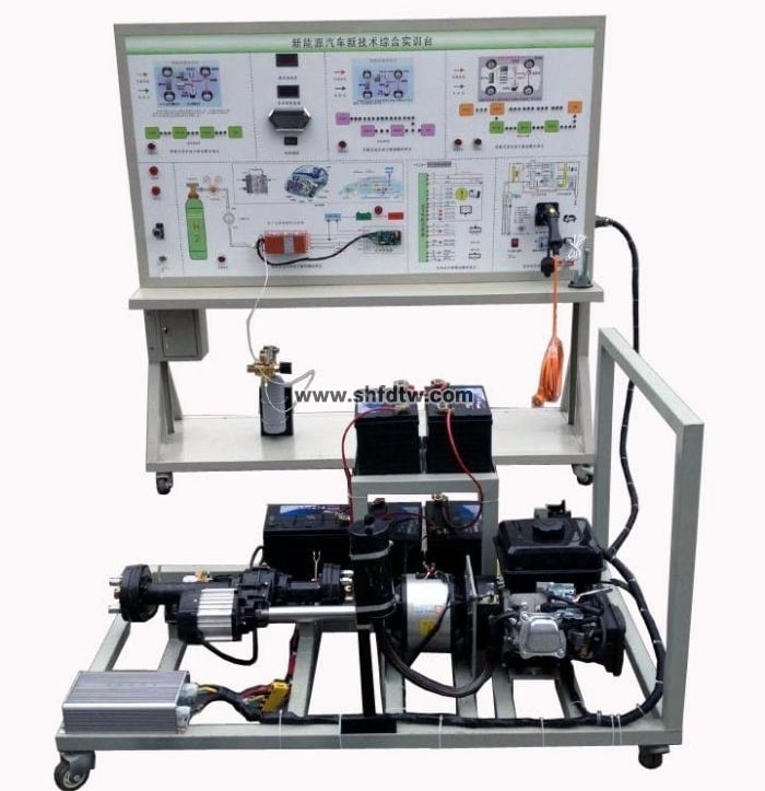 發(fā)電機(jī)、發(fā)動機(jī)、燃料電池及運(yùn)行附件、電池組、逆變器、三相交流電機(jī)、傳動機(jī)構(gòu)、制動機(jī)構(gòu)、故障模擬與考核裝置、檢測面板與可移動臺架等組成。