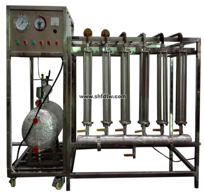 由六組不同性能的傳熱管,蒸汽發(fā)生器和風(fēng)機組成,可觀察和分析在自由對流、強迫對流影響管道傳熱的傳熱系數(shù)K值。 設(shè)備配置:實驗銅管(硅酸鹽保溫管、鋸末保溫管、鍍鉻保溫管、光管保溫管、黑管保溫管、管束保溫管)、配氣管、計量管、低噪音風(fēng)機、電熱鍋爐、壓力保護裝置(限壓閥、電接點壓力表)、壓力表、電控裝置及箱體、控制閥門??刂婆_、不銹鋼支架、由不同性能的傳熱管道(銅裸管、涂黑管、翅片管、玻璃絲棉保溫管、鋸末保溫管、鍍鉻管),蒸汽發(fā)生器等組成。