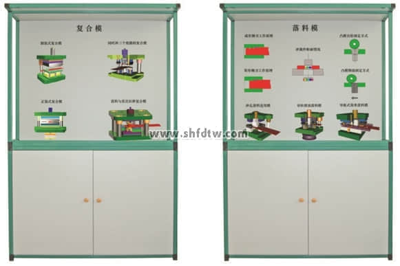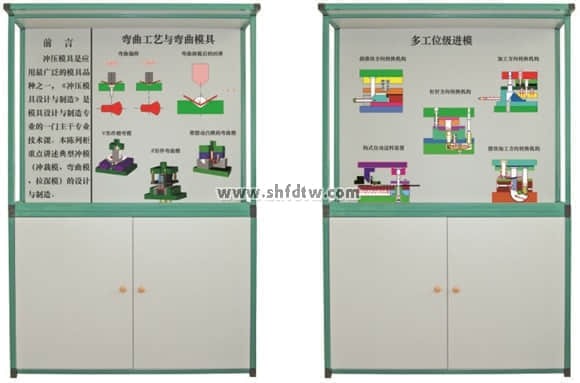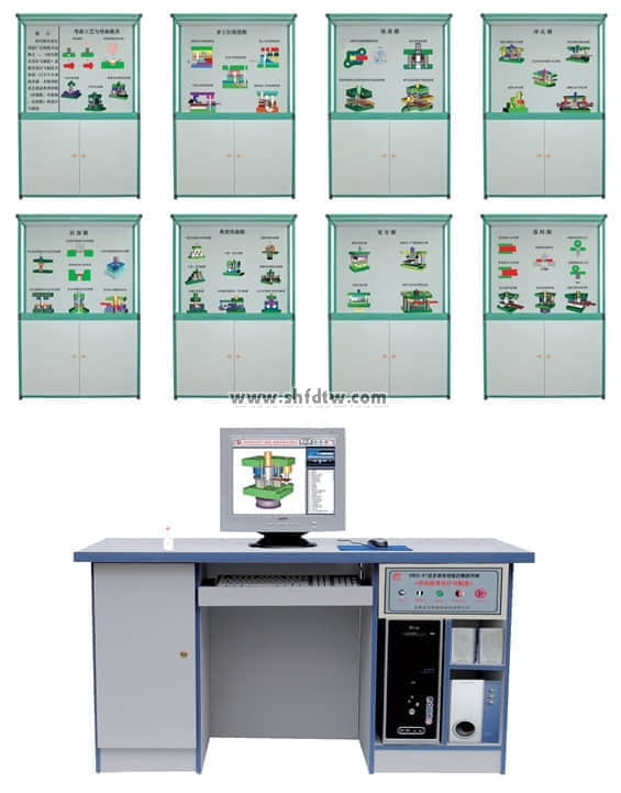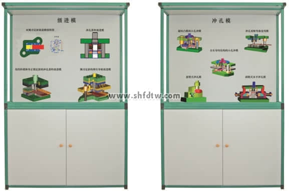 沖壓模具設(shè)計與制造陳列柜共分八個柜和一個電腦控制臺,進(jìn)行多媒體動畫同步演示。由PC電腦軟件控制順序或任選播放三維動畫同步模型演示沖壓模具功能原理。本套陳列柜47件沖壓模具均采用高強(qiáng)度硬聚氯材料制作而成,各種模具均可進(jìn)行拆分裝配。
