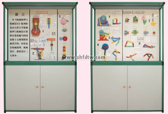 《機(jī)械原理與機(jī)械設(shè)計》陳列柜是根據(jù)天津大學(xué)機(jī)械原理與機(jī)械設(shè)計教研室集體編寫的十五規(guī)劃教材而設(shè)計的一套電化多媒體教學(xué)設(shè)備,內(nèi)容包含機(jī)械原理、機(jī)械設(shè)計、課程設(shè)計三大部分。陳列柜共分十個柜和一個電腦控制臺,進(jìn)行多媒體聲控同步解說演示。由PC機(jī)電腦控制順序或任選運(yùn)行每個柜模型動作,同時電腦播放圖形同步模型動作。