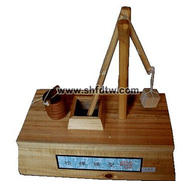 我國古代提水的器具,創(chuàng)造于春秋時(shí)期?!肚f子》一書記載:孔子的弟子貢路過漢陰,向一老農(nóng)介紹說:“有一種汲水的器械用力小,功效大,可日灌四百畦”。他介紹的就是這種名叫桔槔的汲水器具,它是利用杠桿的原理,能較省力的提上重物——水。體現(xiàn)了我國古代勞動(dòng)人們的聰明智慧。本模型是根據(jù)畫像石刻《桔槔汲水圖》的資料仿制而成》。