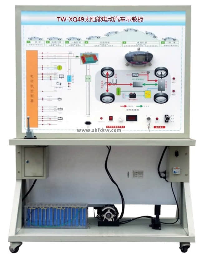 3、面板上安裝有點火開關、工況開關、油門踏板、擋位開關、制動開關、轉(zhuǎn)速表、電流指示表、太陽能裝置等,裝有一臺電機用來演示電動機的工作狀態(tài),及安裝太陽能充電板演示太陽能充電工況。