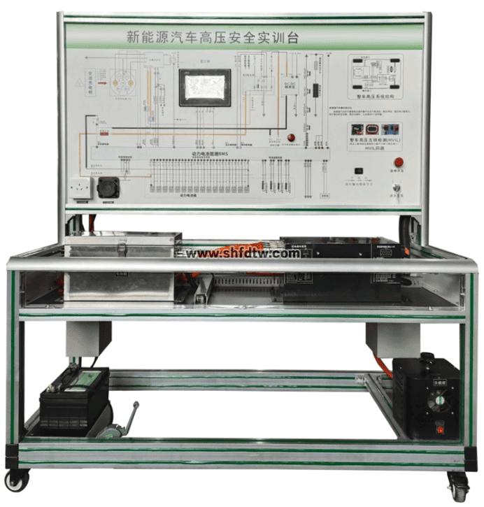 電動汽車磷酸鐵鋰電池(帶CAN-BUS通訊與電池管理器,帶維修塞模塊/絕緣檢測模塊)、7寸動力電池包觸摸顯示屏、放電指示燈、點火開關(guān)、模擬漏電開關(guān)、車載充電器(帶CAN-BUS通訊)、國標(biāo)充電槍與插座(帶CC,CP信號)、電池高壓安全管理系統(tǒng)(帶CAN-BUS通訊)、霍爾式電流傳感器、高壓配電箱(帶繼電器與保險絲模塊)、直流接觸器(包含充電繼電器、總正繼電器、總負(fù)繼電器、預(yù)充繼電器)、DC-DC轉(zhuǎn)換器、輔助蓄電池(12V45AH)、一體化全鋁合金型材搭建的移動臺架(1500×700×1700mm 帶自鎖腳輪裝置,帶安裝檢測端子的原理面板,面板1448×940mm)、設(shè)備操作說明書。