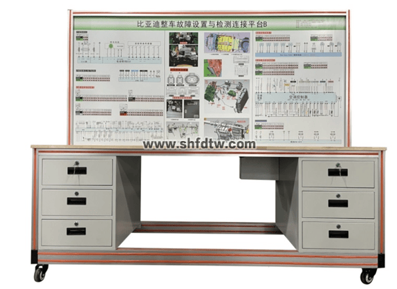 1.整車故障設置與檢測連接平臺(帶雙抽屜)1套:新能源三電電控系統(tǒng)1套,組合儀表等其他低壓電器電控1套;