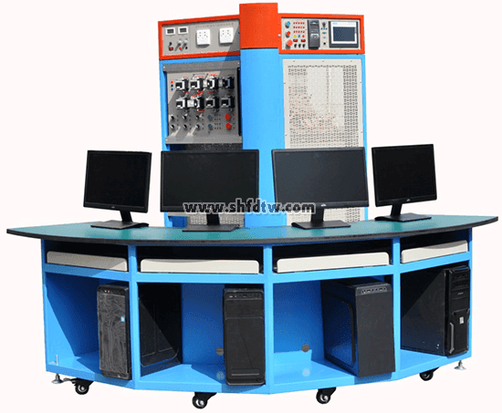 ★3、實訓電源屏:采用人字形6面設(shè)計,面板裝有PLC主機、變頻器、觸摸屏,交流電源輸出,低壓直流電源,所有輸出輸入端口均采用安全型雙圈插座引出。鋼制結(jié)構(gòu),面板采用彩色描繪。每組電源都具有漏電保護、短路保護功能。電源控制屏裝有可定位旋轉(zhuǎn)機構(gòu),根據(jù)不同的實訓要求可以旋轉(zhuǎn)至對應的實操工作面,旋轉(zhuǎn)機構(gòu)要牢固、安全、可靠。