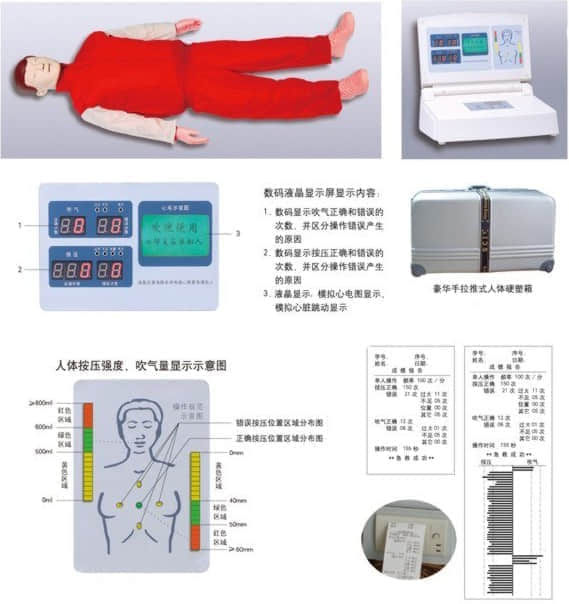 ■ CPR心肺復(fù)蘇:根據(jù)美國心臟協(xié)會(AHA)2010國際心肺復(fù)蘇(CPR)&心血管急救(ECC)指南標準設(shè)計,可進行人工呼吸和心外按壓,全程中文語音提示也可以英文提示。 標準的氣道開放,實時操作曲線顯示,對正確和錯誤的操作語言提示,統(tǒng)計數(shù)據(jù)打印成績,可選擇訓(xùn)練和考核方式。