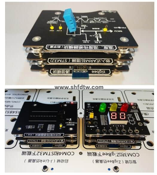 模塊均采用磁吸式接口設(shè)計(jì)+搭積木式結(jié)構(gòu),集成標(biāo)準(zhǔn)的12路彈性插針,可以實(shí)現(xiàn)供電、仿真調(diào)試、數(shù)據(jù)通信、IO口拓展等功能,同時(shí)支持搭積木式的多級(jí)磁吸聯(lián)接,通過彈性插針即可通信,無須外接跳線,通過模塊相互搭積木,組成一套完整的物聯(lián)網(wǎng)系統(tǒng),如:STM32處理器+ZigBee無線模塊+傳感器模塊(3層垂直積木,無須額外接線),可拓展性強(qiáng),如下圖所示: