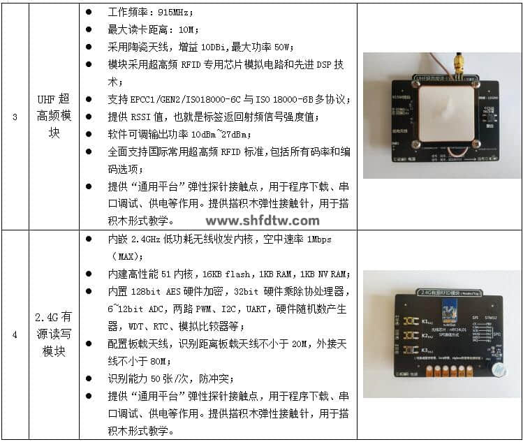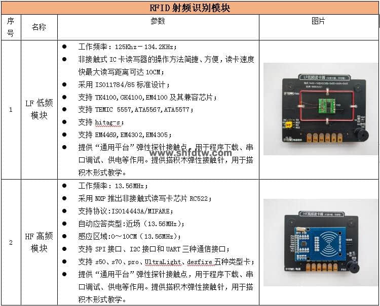 (選配)RFID 射頻識(shí)別模組:125K(LF低頻讀卡器*1)、13.56M(HF 高頻讀卡器*1)、900M(UHF 超高頻讀卡器*1)、2.4G(有源RFID*2)、NFC 讀卡器(1個(gè))、條碼采集節(jié)點(diǎn)(1個(gè)),提供源碼、DEMO 例程、智能門禁等演示軟件;