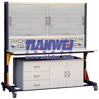 本設(shè)備由實訓(xùn)屏(內(nèi)置電源)、實訓(xùn)桌、儲物柜三大部分組成。以30mm×30mm成型方鋼作為設(shè)備主要框架材料;實訓(xùn)屏、地盤采用焊接連接、關(guān)鍵部位采用三角筋用內(nèi)六角螺釘加固連接,表面經(jīng)高溫噴塑處理,美觀大方且有效起到防銹絕緣的作用;由兩條35mm×35mm鋁合金型材及滑槽組成網(wǎng)孔板固定機構(gòu);固定機構(gòu)的下方是鐵制雙工位電源箱,每工位電源箱的布局依次為電源保護裝置、電源指示裝置、電源輸出;實訓(xùn)桌桌面采用25mm麻灰色高密度層壓板封邊特制,有效提高絕緣等級;實驗桌底部裝有至少4個導(dǎo)向輪,方便設(shè)備移動;