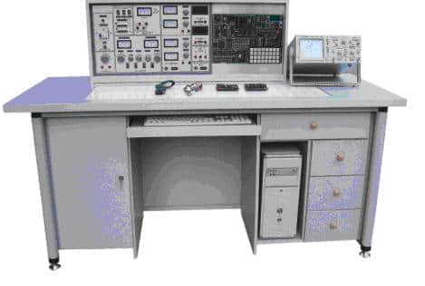 一桌二座,桌面中央設置九孔通用電路插板,元件盒在其上接插成數(shù)字、模擬實驗電路完成實驗。元件盒盒體透明,內裝元件一目了然,盒蓋印有永不褪色元件符號,盒蓋與盒體采用科學的壓卡式結構,維修拆裝方便。實驗桌左右各有一個柜,柜中存放元器件,中部抽屜存放工具、萬用表、導線等。桌面尺寸:160×70cm。