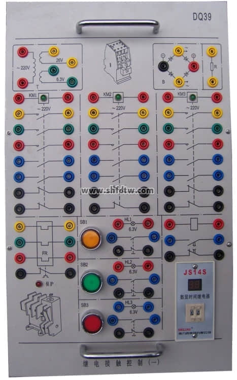 提供交流接觸器(線圈電壓220V)三只,熱繼電器一只,電子式時(shí)間繼電器(通電延時(shí), 工作電壓220V)一只,變壓器(220V/26V/6.3V)、整流電路、能耗制動(dòng)電阻(10Ω/25W)各一組,帶燈按鈕(黃、綠、紅各一只)三只。面板上畫有器件的外形,并將各器件的工作端子引到面板上,供實(shí)驗(yàn)接線用,器件的工作狀態(tài)均有發(fā)光二極管指示。面板設(shè)有搖臂結(jié)構(gòu),可看到具體器件并對(duì)可需要調(diào)節(jié)的器件進(jìn)行調(diào)節(jié)。