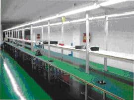 c、線體每兩工位配40W日光燈照明一套,每工位配四位工位插座一只(其中2為為二腳,2位為三腳),帶烙鐵筒帶插座工具箱一只(工具箱尺寸為寬300mm,高400mm,深220mm),工藝圖板一套(A3無色透明,2塊); d、臺面采用厚18mm雙面貼塑板制作,上鋪綠色防靜電橡皮,槽鋁包邊;