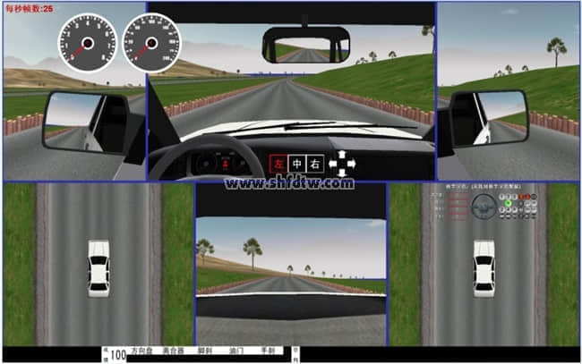 在科目三道路駕駛訓(xùn)練中,進(jìn)入場景后,默認(rèn)為6視窗訓(xùn)練模式,左上視圖為局部放大的左后視鏡窗口,中上視圖為前視圖,右上視圖為右后視鏡窗口,左下視圖為俯視,中下視圖為后車窗,右下視圖為教學(xué)示范窗口(如果新學(xué)員不熟悉科目三道路駕駛考試規(guī)則,可以先觀摩教學(xué)示范后再進(jìn)行訓(xùn)練)。