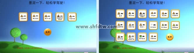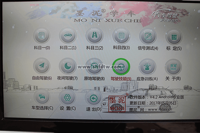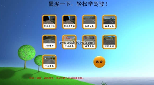 主界面中間是一輛在轉(zhuǎn)盤上旋轉(zhuǎn)的車輛,該車輛為當(dāng)前選擇進(jìn)行訓(xùn)練的車輛(可以是捷達(dá)、東風(fēng)、拖車等等)。圍繞車輛和轉(zhuǎn)盤,共有12個按鈕,分別是:理論知識(包含科目一和安全文明駕駛考試)、場地訓(xùn)練(科目二)、道路訓(xùn)練(科目三)、天氣設(shè)置、軟件設(shè)置、時間設(shè)置、退出系統(tǒng)、被動駕駛、交通標(biāo)志、駕駛回放、車型選擇和原地駕駛。