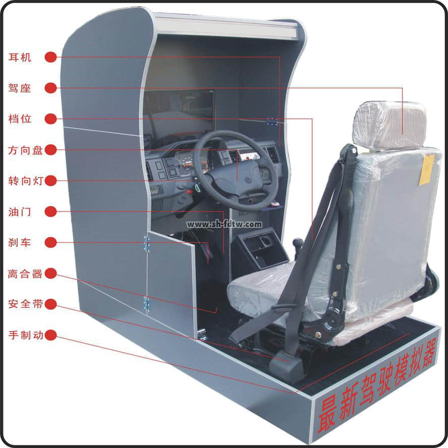 座艙包含了與真實(shí)車輛相同的操作部件,“五大”操縱機(jī)構(gòu):方向盤、離合器,腳剎,油門和手剎。真車變速器:倒檔、一檔、二檔、三檔、四檔、五檔和空擋(自動(dòng)檔只含前進(jìn)檔、倒車檔和駐車檔)。真車操作開關(guān):左轉(zhuǎn)向燈、右轉(zhuǎn)向燈、應(yīng)急燈、喇叭、點(diǎn)火開關(guān)、總電開關(guān)、安全帶、車門、雨刷、遠(yuǎn)光燈、近光燈、遠(yuǎn)近光交替。
