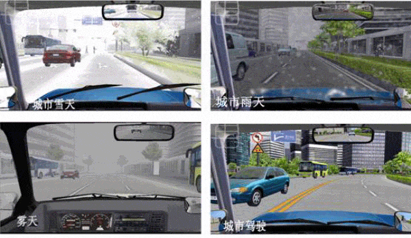 目前的駕駛模擬軟件只支持單一的訓(xùn)練天氣,如“晴天”,“雨天”等等。本系統(tǒng)除了設(shè)置單一訓(xùn)練天氣“晴天”,“雪天”,“雨天”,“黑夜”,“霧天”外,還設(shè)置了“全天候”天氣訓(xùn)練,在一個(gè)訓(xùn)練場(chǎng)景中變換訓(xùn)練天氣,例如開始訓(xùn)練時(shí)候可能是晴天,訓(xùn)練一段時(shí)間后變?yōu)椤坝晏臁?,過一段時(shí)間后又變?yōu)楹谝?,?xùn)練學(xué)員對(duì)于各種不同天氣的適應(yīng)能力。