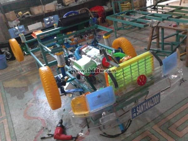 車架(底盤)、前橋與前懸架、鉗盤式制動器(前輪)、等速式萬向節(jié)、發(fā)電機(jī)、起動機(jī)、汽油泵、濾清器、發(fā)動機(jī)總成、變速箱、離合器、儀表盤、方向盤、油門、制動