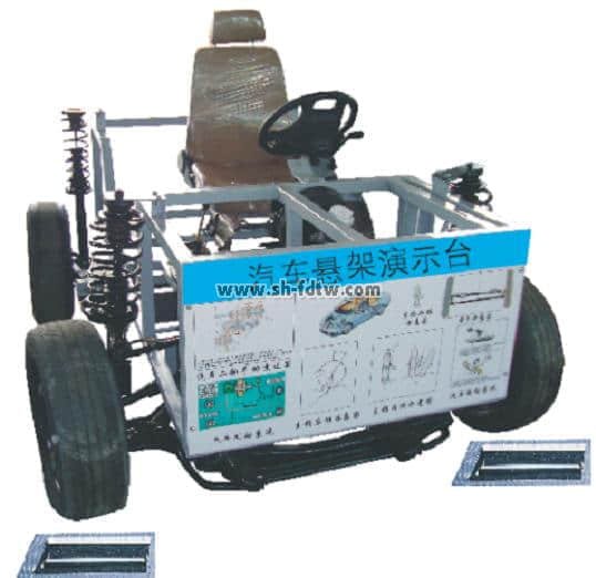 四種不同獨立懸架系統(tǒng)、交流調(diào)速電動機、凸輪偏心裝置、減震器、輪胎、彩色結(jié)構(gòu)原理圖板、可移動式臺架等。