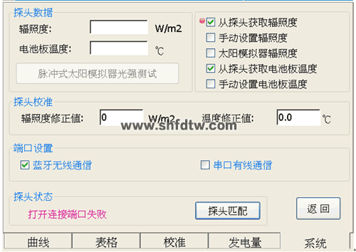 環(huán)境參數(shù)獲取方式靈活多樣,提供了從探頭獲取數(shù)據(jù)或手動設(shè)置功能,并額外提供了脈沖式太陽模擬器光強測試功能。由于日常使用環(huán)境的變化,對探頭的測試數(shù)據(jù)會產(chǎn)生一定影響,為用戶貼心設(shè)計了修正系數(shù)設(shè)置。探頭與主機的連接方式也分為藍牙與串口連線兩種選擇方式。