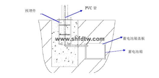 2、4、地基預(yù)埋件放入地基澆筑坑的中間,將PVC塑料管的一端放在蓄電池箱內(nèi),在將PVC塑料管的另一端放在基礎(chǔ)結(jié)構(gòu)件固定底版中心穿出0.2米。一切準(zhǔn)備就緒,用C20混凝土澆灌后用震動(dòng)棒震動(dòng)即可。