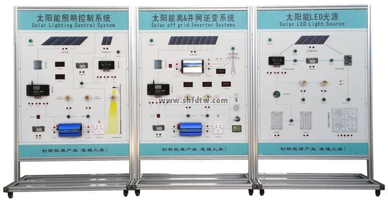 光伏發(fā)電系統(tǒng)集成演示版,主要由A、B、C三塊主模板組成。A 太陽能照明控制系統(tǒng)演示模板、B 太陽能離&并網(wǎng)逆變系統(tǒng)演示模板、C 太陽能LED光源系統(tǒng)演示模板。