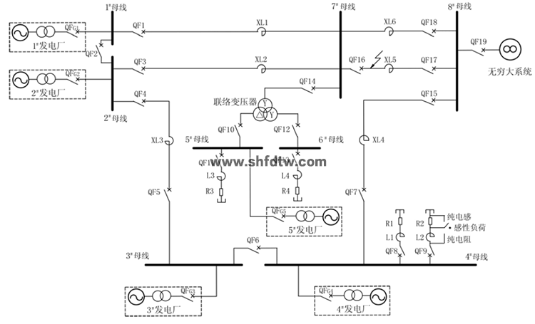 1)G1、G2、G3、G4、G5分別模擬5個(gè)發(fā)電廠,從5臺(tái)發(fā)電機(jī)的母線引電纜分別聯(lián)接到電力網(wǎng)母線WB1、WB2、WB3、WB4、WB5上,模擬無(wú)窮大電源S則由市電380V經(jīng)20KVA自耦調(diào)壓器接至母線WB8上,三組感性負(fù)荷分別聯(lián)至WB5、WB6母線上。而WB4經(jīng)聯(lián)絡(luò)變壓器與線路中間站W(wǎng)B7母線相聯(lián),整個(gè)一次系統(tǒng)構(gòu)成一個(gè)可變結(jié)構(gòu)的電力系統(tǒng)網(wǎng)。