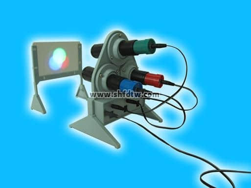 塑料外殼350× 200×150,光罩 φ35×30,工作電壓DC6V、0 .3A,內(nèi)外接電源均可 ,三色光可單獨(dú)或合并工作,色光合成明顯 ,探究三色光可合成所有自然界的可見光。
