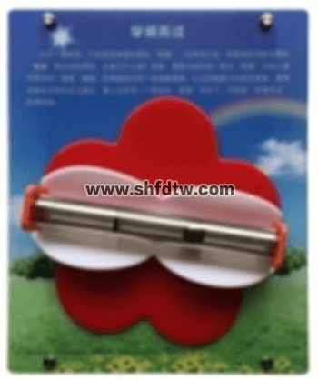 規(guī)格:400mm*600mm;主要展示器件安裝于兩塊亞克力前后板上;前板為5mm厚透明亞克力板,后板為UV印制的5mm厚白色亞克力板;前后板可用6顆38mm的工藝螺釘固定于墻體上;背板裝有防塵保護罩。圓筒的兩端各包有一張偏振薄膜,它們的偏振方向相互垂直,使得光線在交接處無法通過,看上去有一個黑色的“隔墻”;轉(zhuǎn)動圓盤,小球可以自由地來回穿過“黑墻”。