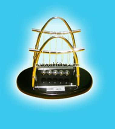 底座150×145×20(二端以四分之一圓倒角 ), 塑料鍍鉻架φ10×135×160,鋼性球φ20共5只。變化端的碰撞球,演示動能的傳遞。
