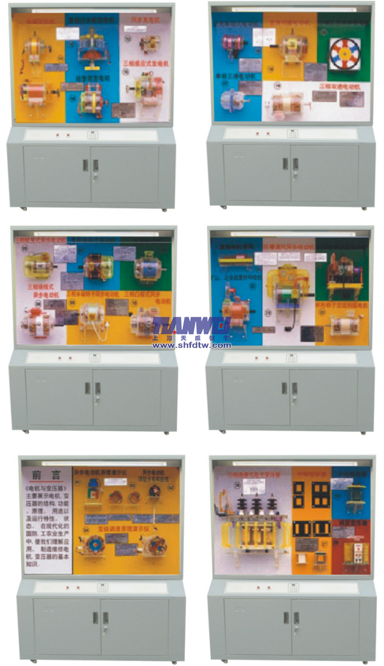 根據全國各大學院學校機械類通用教材《電機與變壓器》示教陳列柜是一套電化教學設備。柜體采用SPCC冷扎板焊成,堅固美觀,表面采用中溫磷化防銹漆、平光漆,靜電噴涂。模型材料采用進口有機板制造,板面附有必要的圖表和文字說明,演示形象逼真,運行可靠。是一套現代化機械課程教學設備。