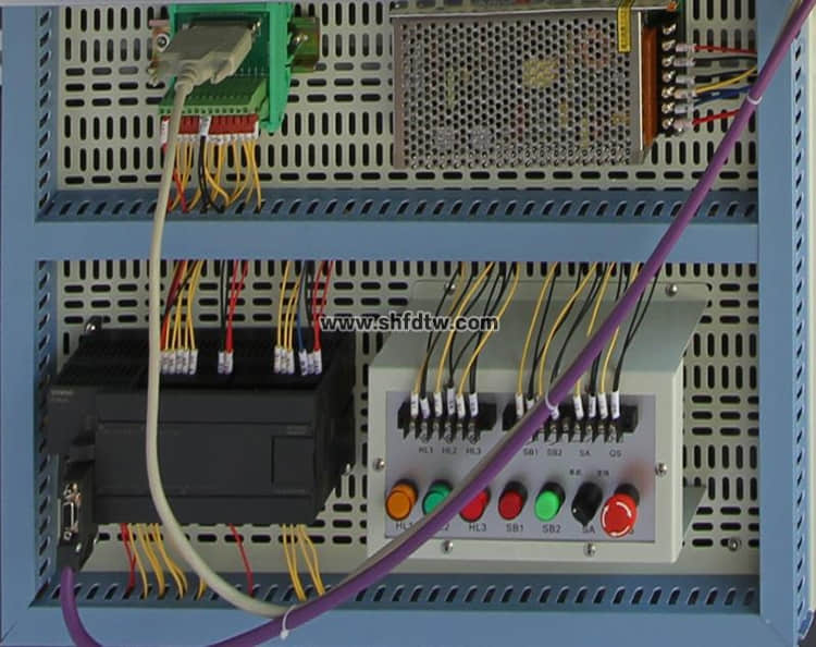 3、按鈕模塊:開(kāi)關(guān)電源24V/6A,急停按鈕1只,轉(zhuǎn)換開(kāi)關(guān)2只,蜂鳴器1只,復(fù)位按鈕黃、綠、紅各1只,自鎖按鈕黃、綠、紅各1只,24V指示燈黃、綠、紅各2只;