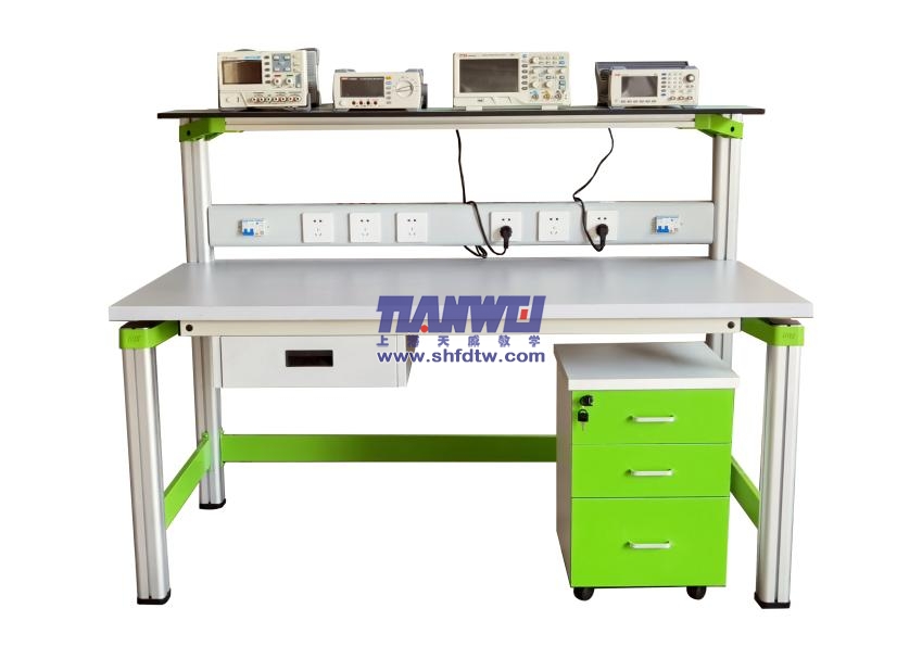 實(shí)訓(xùn)桌規(guī)格為1600(長(zhǎng))*750(寬)*1350(高),設(shè)有二個(gè)抽屜;實(shí)驗(yàn)桌主體結(jié)構(gòu)全部采用高性能表面氧化的鋁型材及一次成型鋁壓鑄框架連接構(gòu)件,連接構(gòu)件采用壓鑄成型工藝(非焊接工藝),經(jīng)機(jī)加工、拋丸、噴砂,表面靜電噴涂工藝,安裝方便、快捷,用戶可自行DIY組裝。桌體立柱采用工業(yè)鋁型材成型工藝,表面氧化處理,截面尺寸:90mm×90mm,四面帶槽,槽寬約8mm,端部裝有注塑成型配套塑料堵頭。桌面采用25mm三聚氰胺飾面板,配有一塊防靜電絕緣皮。貼桌面板下設(shè)支撐框架,承受力不少于200kg。配備儲(chǔ)存柜,存放元件及工具,儲(chǔ)存柜底部4只高強(qiáng)度萬(wàn)向可制動(dòng)PU腳輪,方便移動(dòng)。實(shí)訓(xùn)裝置整體簡(jiǎn)約不簡(jiǎn)單,高端大氣,符合現(xiàn)代化產(chǎn)品審美和發(fā)展趨勢(shì)。