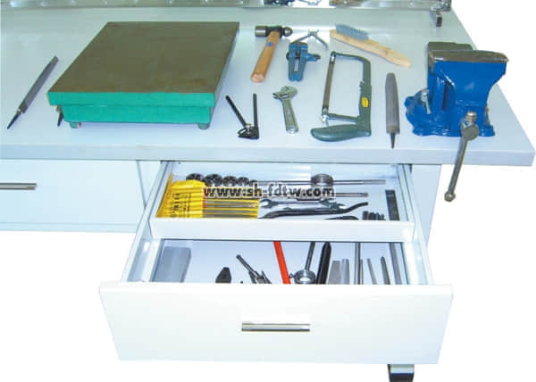 上海天威鉗工實訓臺主體為鐵質(zhì)材料,桌面是3.2mm厚木質(zhì)材料,上面再鋪上1mm厚鐵板,另外加上黑色皮墊,產(chǎn)品整體非常堅固。鋼絲防護網(wǎng)和鉗工桌腳采用的是方形管,尺寸是60×60mm,厚度是2mm。整體結(jié)構(gòu)堅固。中間有兩個帶鎖的抽屜,可以放置相關(guān)工具和資料。