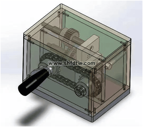 轉(zhuǎn)角指示塊、左側(cè)板、頂板、輸出齒輪、輸出軸軸承座、支撐板、底板、右側(cè)板、后板、不完全滑移齒輪組、換擋拔叉、換擋連桿、換擋拔桿、傘齒輪、中隔板、從動鏈輪、鏈條、手柄、搖臂、主動鏈輪、前板、動力軸、從動軸、移滑齒輪軸、輸出軸