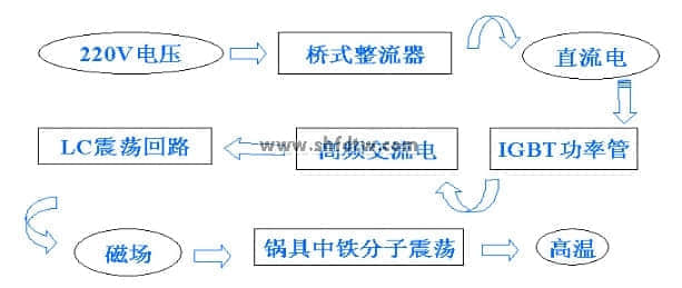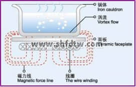 當(dāng)電磁爐在正常工作時(shí),由整流電路將50Hz的交流電壓變成直流電壓,再經(jīng)過(guò)控制電路將直流電壓轉(zhuǎn)換成頻率為20-40KHz的高頻電壓。電磁爐線(xiàn)圈盤(pán)上就會(huì)產(chǎn)生交變磁場(chǎng),磁力線(xiàn)就會(huì)在鍋具底部反復(fù)切割變化,使鍋具底部產(chǎn)生環(huán)狀電流(渦流),并利用無(wú)數(shù)的小渦流高速振蕩鐵分子,致使器皿本身自行高速發(fā)熱,然后通過(guò)熱量傳遞原理,使器皿加熱盛裝在其內(nèi)的東西。
