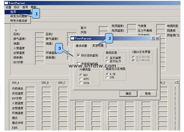 文本顯示界面:可測試壓縮機(jī)的運(yùn)轉(zhuǎn)頻率,傳感器的各種數(shù)據(jù),電子膨脹閥的工作步數(shù)等幾十種中央空調(diào)的工作數(shù)據(jù)和狀態(tài),
