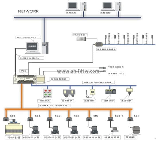 TW-J519中央空調(diào)實(shí)訓(xùn)考核裝置(網(wǎng)絡(luò)型)要求系統(tǒng)采用6匹水冷機(jī)組,不銹鋼框架結(jié)構(gòu),終端建立一個專門房間進(jìn)行客戶的模擬,大廳的模擬直接利用教室原來空間,采用分水器和集水器對冷量或熱量進(jìn)行分配調(diào)節(jié),整個中央空調(diào)采用三菱FX3U-38MR PLC可編程控制器及工業(yè)總線控制,由計(jì)算機(jī)通過通信總線與PLC進(jìn)行通信,控制整個中央空調(diào)的運(yùn)行??照{(diào)的運(yùn)行參數(shù)由各類傳感器進(jìn)行采集,并通過通信總線送入計(jì)算機(jī)中,通過專用中央空調(diào)組態(tài)控制軟件進(jìn)行實(shí)時監(jiān)控。組態(tài)軟件要求能夠以動畫的形式同步顯示系統(tǒng)的設(shè)備結(jié)構(gòu)、控制原理和流程。