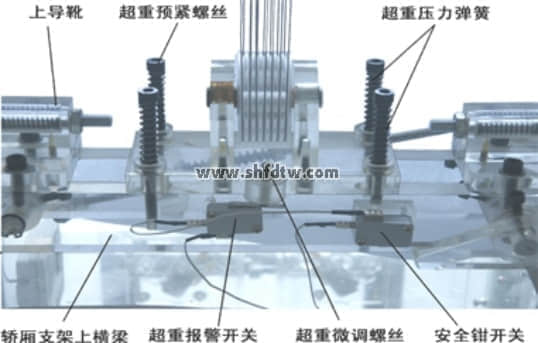 當(dāng)轎廂內(nèi)的壓力達(dá)到5公斤時(shí),彈簧被壓下,微動(dòng)開(kāi)關(guān)斷開(kāi)。通過(guò)電氣系統(tǒng)控制電機(jī)停止運(yùn)行并輸出報(bào)警信號(hào),這時(shí)只有減少轎廂內(nèi)重到規(guī)定范圍內(nèi)電梯才能關(guān)門(mén)、起動(dòng)。