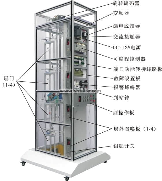 電梯是根據(jù)常見的升降式電梯結(jié)構(gòu),采用透明有機(jī)材料制成,其結(jié)構(gòu)與實(shí)際電梯完全相同,且?guī)缀蹙邆淞藢?shí)際電梯的所有功能。事實(shí)上可以把它看作是小型化了的真實(shí)電梯。為了便于教學(xué),電梯大部分部件均是采用透明有機(jī)材料制成,使得電梯的內(nèi)部結(jié)構(gòu)一目了然;同時(shí),電梯的運(yùn)行過程,以及每個(gè)動(dòng)作都十分明了,且可以反復(fù)實(shí)際動(dòng)手操作。使學(xué)生能夠很直觀、透徹地了解、掌握電梯的結(jié)構(gòu)及其動(dòng)作原理,達(dá)到事半功倍的效果。解決了以往電梯教學(xué)中單純的理論教學(xué)方式或是參觀實(shí)際電梯時(shí)所帶來的不安全,無法全面了解其內(nèi)部結(jié)構(gòu)及運(yùn)行過程等種種實(shí)際問題。
